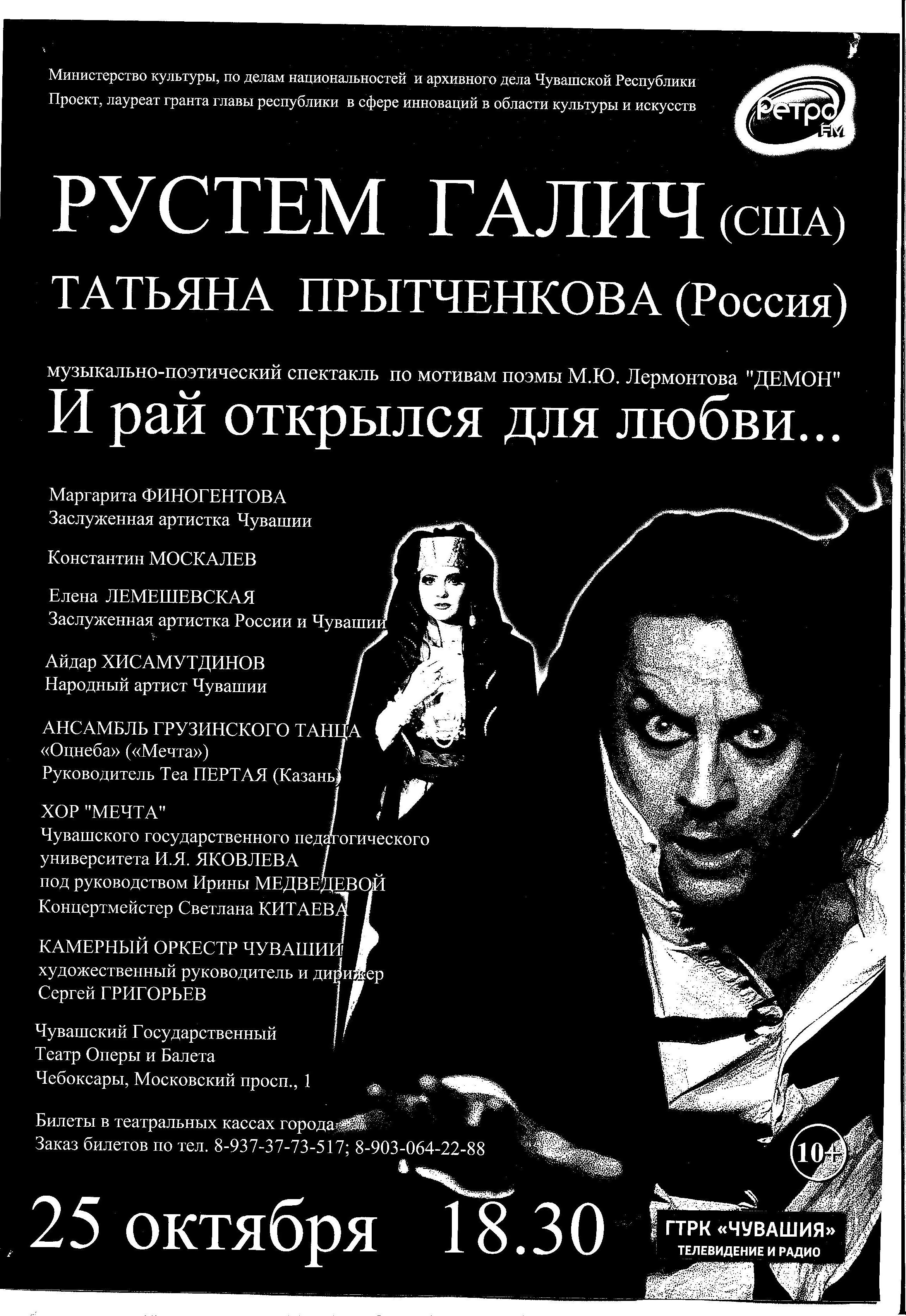По мотивам поэмы М. Ю. Лермонтова «Демон». Актер, режиссер и постановщик спектакля Рустем Галич (США), наряду с профессиональными коллективами и солистами, привлек к участию в нем и хор «Мечта» студентов факультета художественного и музыкального образования (руководитель - Медведева И.А., концертмейстер - Китаева С.В.). Обновленный спектакль (премьера состоялась два года назад) прошел с большим успехом.