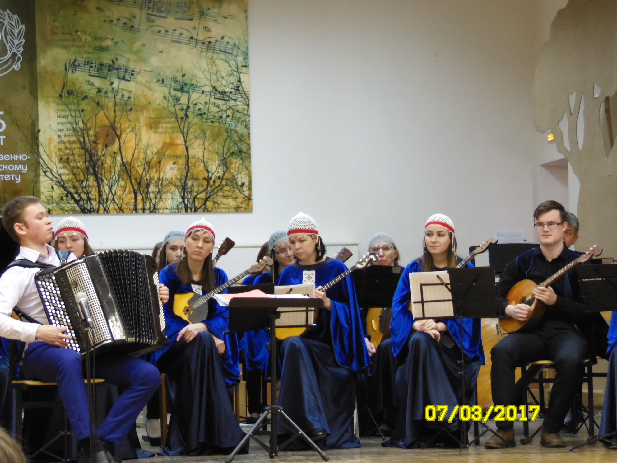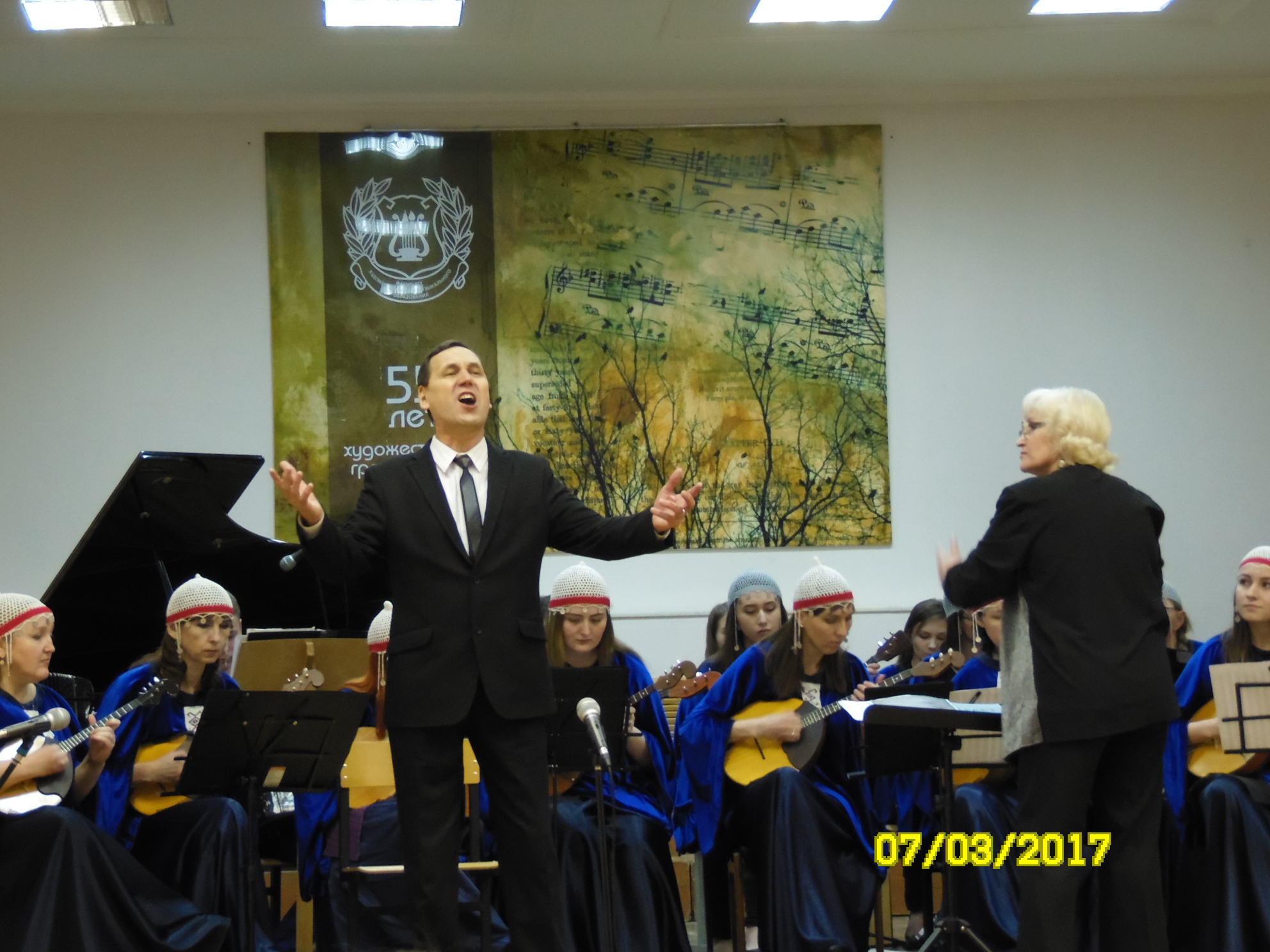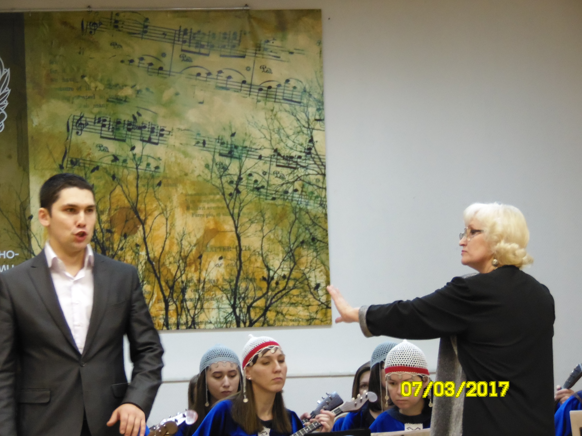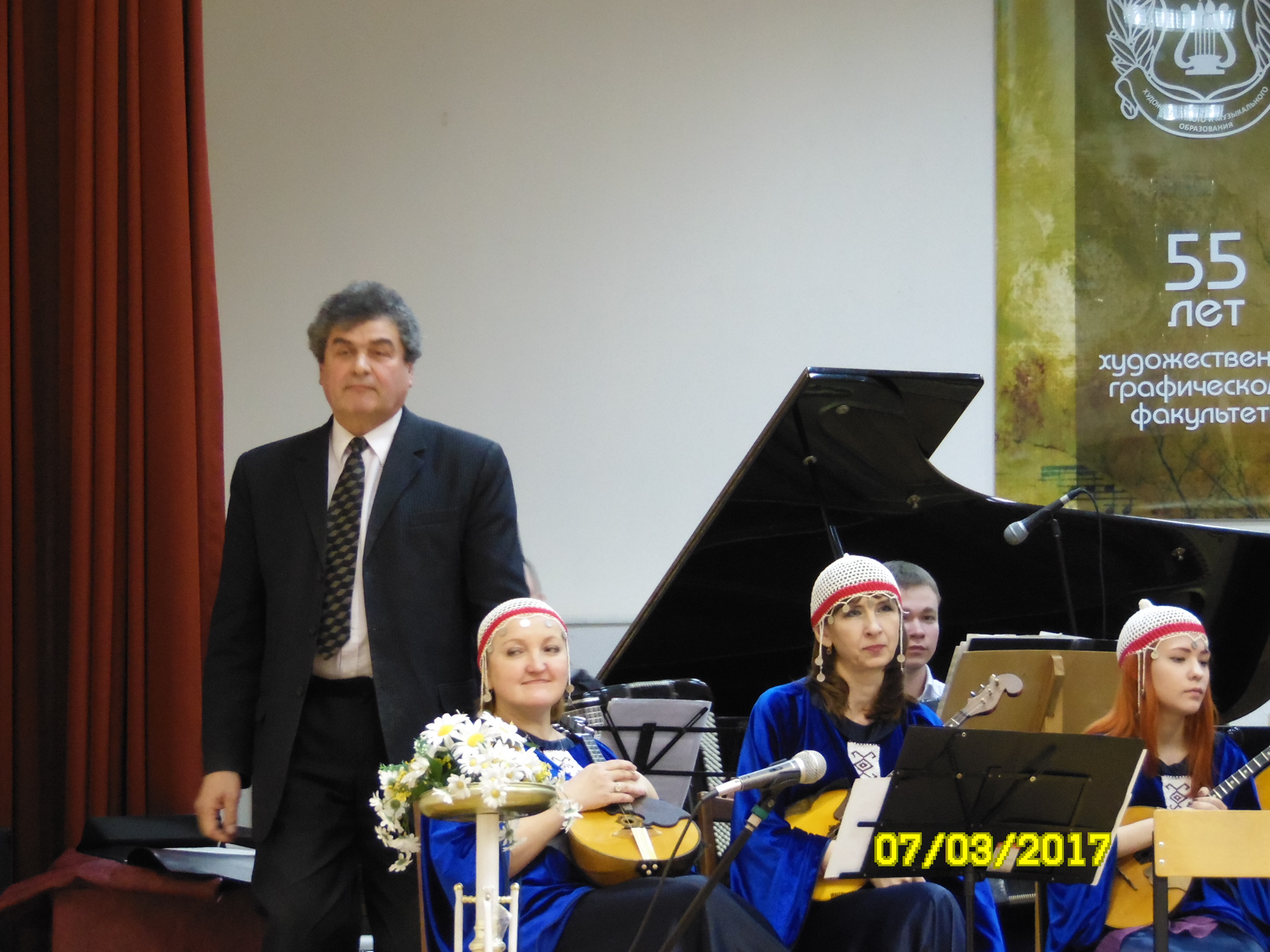 В исполнении оркестра народных инструментов под управлением Т.М. Лукашевич прозвучали популярные произведения. Педагоги мужчины - В.Г. Егоров, А.Р. Канюка, П.Д. Заломнов, В.В. Ашмарин со сцены дарили свои признания через романсы и песни, а виртуозные партии баяна с оркестром были переданы А.М. Васильевым, П.С. Васильевым, студентом Я. Федоровым. Партия рояля с оркестром прозвучала от Ю.И. Трепова. Концерт прошел просто прекрасно.