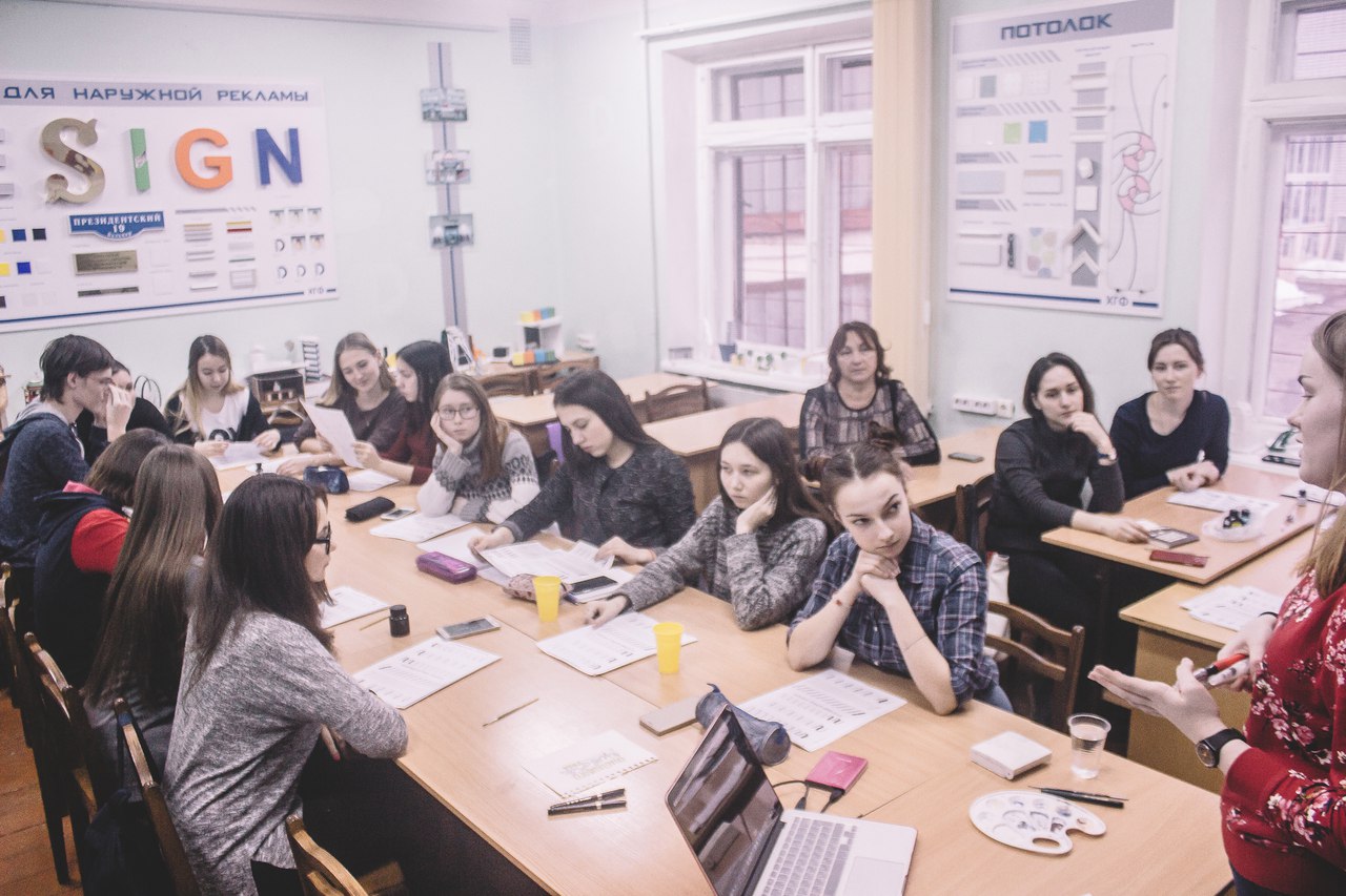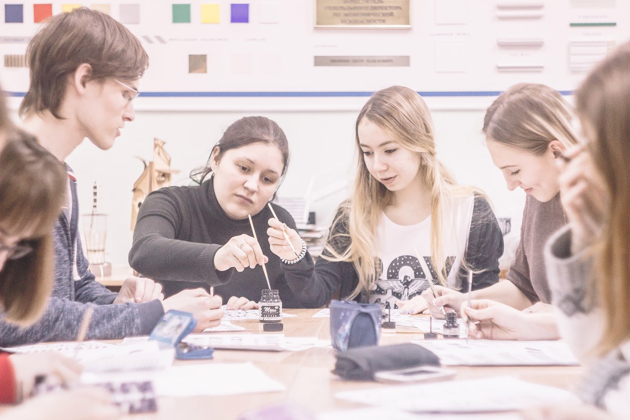 Катя увлекательно рассказала о современной каллиграфии и леттеринге, их применении в различных областях графического дизайна. Она ознакомила присутствующих с целым арсеналом современных инструментов каллиграфа и с приемами работы ими. Пришедшие студенты с интересом выслушали рассказ Кати и старательно выполнили приготовленные ею упражнения.