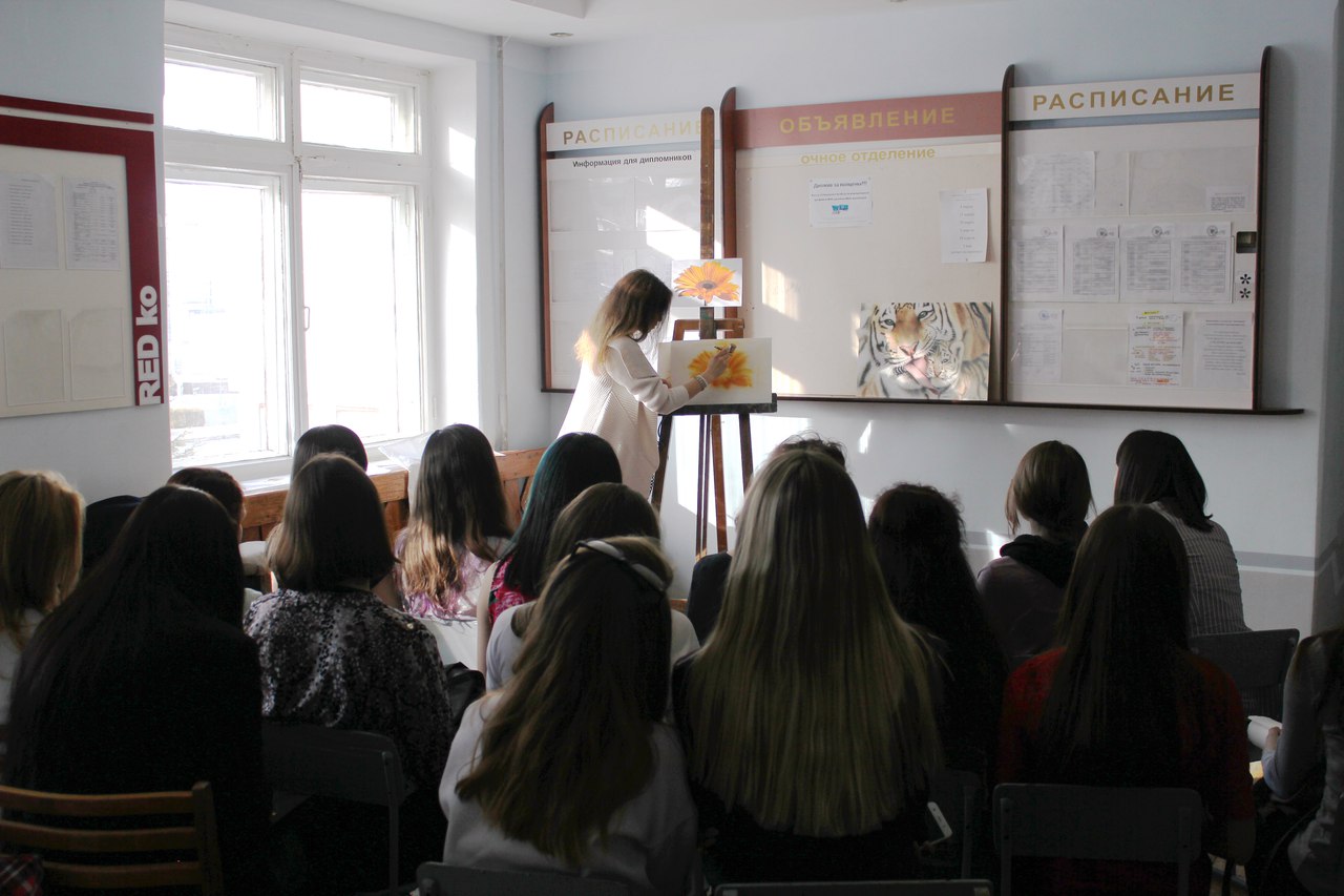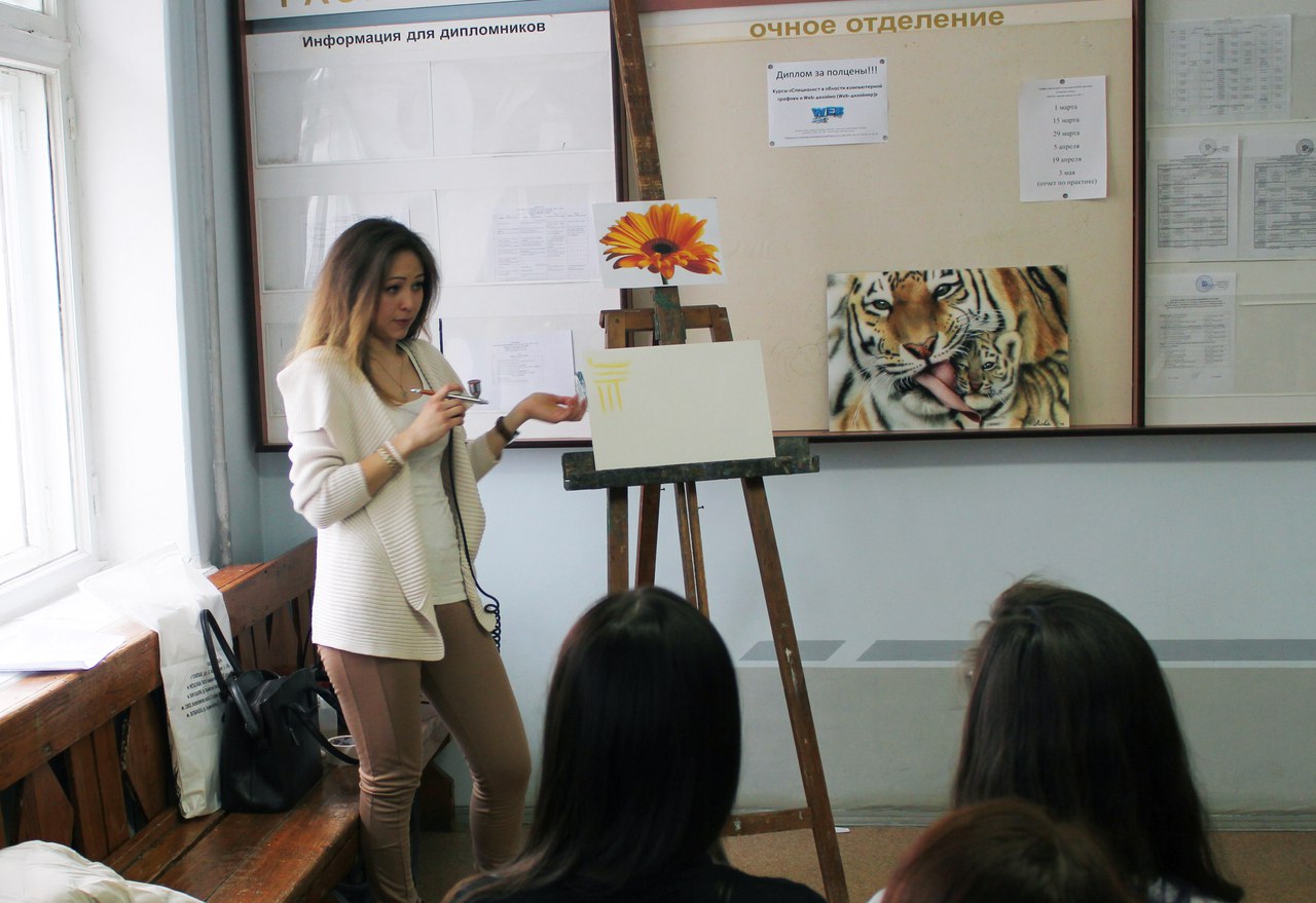 Алина рассказала пришедшим студентам о возможностях аэрографии, используемых инструментах и материалах, показала основные приемы работы аэрографом. Желающие могли попрактиковаться. Алина, ты молодец!